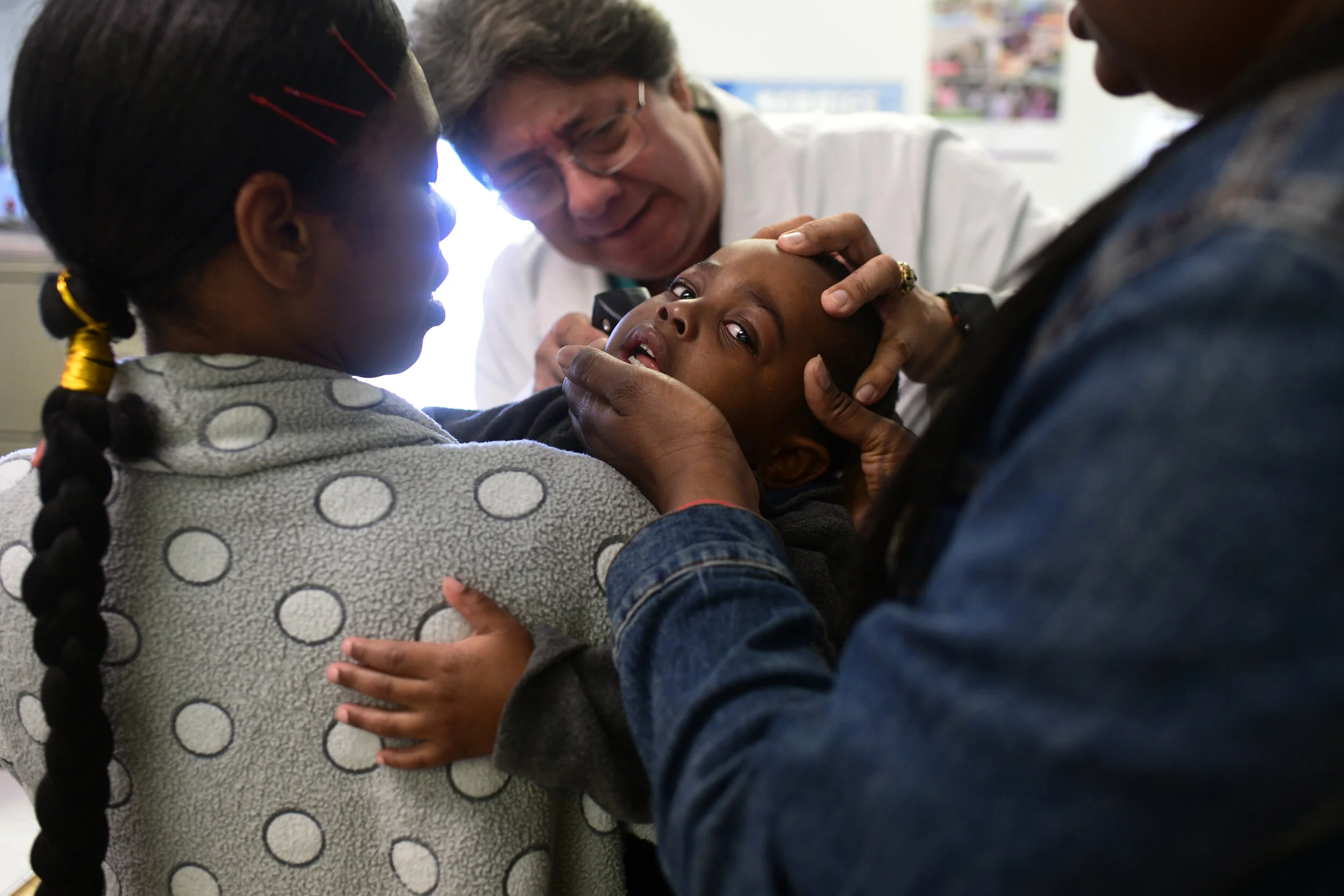 Delta Health Center pediatrician Dr. J. Abraham Rodriguez checks King Coleman's ears as his mother, LaKourtney Giles, and health services worker Tisha Farmer hold him on Jan. 28, 2020, at Bolivar County Head Start Cleveland Center #2. During the free physical exams, about a dozen children had their vision and hearing tested, and those under 2 years old were given a hemoglobin test.