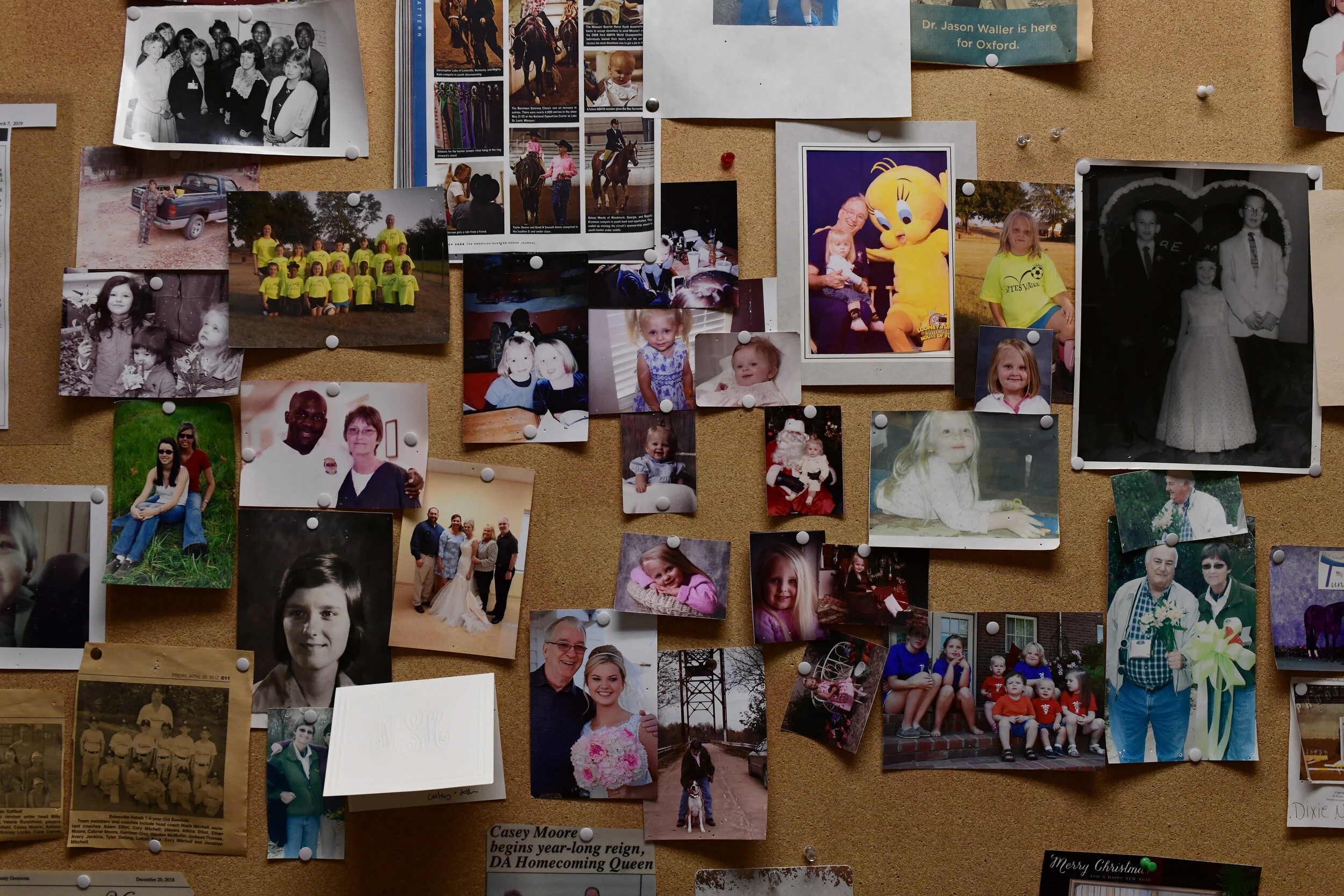 Pictures of family and friends are posted on a cork board lining the hall at Family Medical Center in Marks, Mississippi. The clinic is the only available health care service in the area after Quitman County Hospital closed in 2016 due to finances.