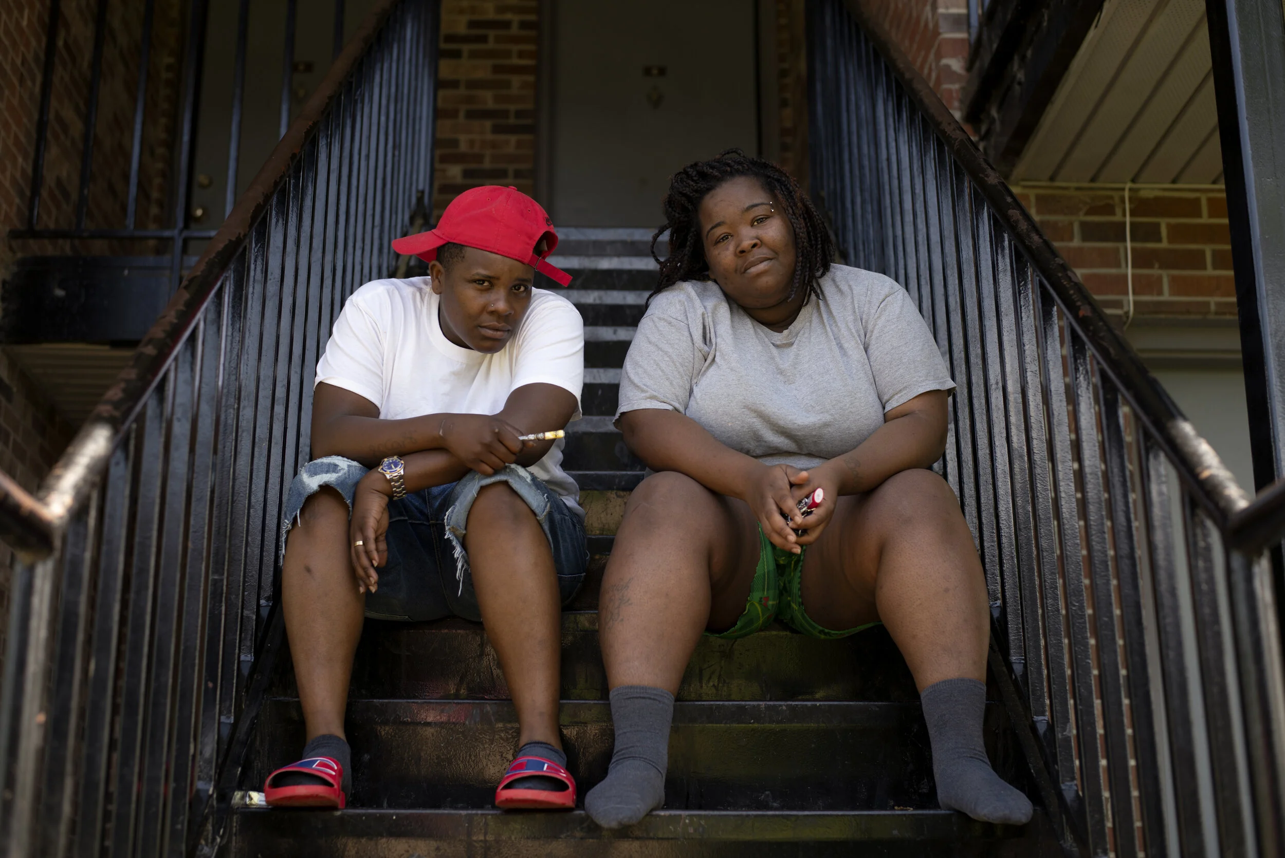 Sherie Bailey, left, and Keiundra Walker pose for a portrait while watching their children play outside of Twin Oaks Apartments on April 9, 2020, in Mayersville, Mississippi. Walker received a notice from the landlord of the complex stating that residents were not allowed to have visitors due to COVID-19. Walker is a home health aide who does not have personal protective equipment to use while entering residents' homes. She was informed by her employer that she would have to provide the equipment herself.