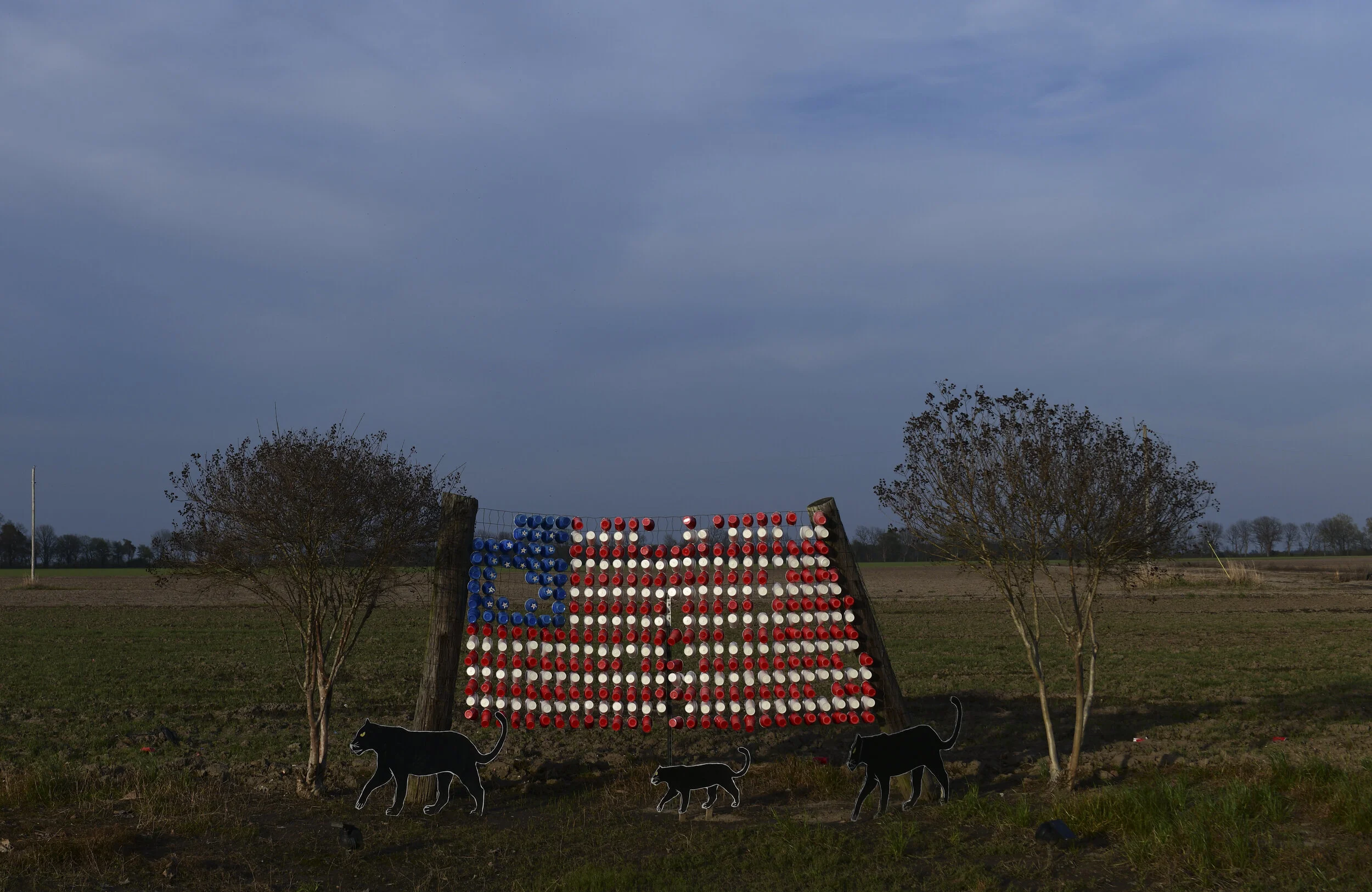 A solo cup American flag leans along U.S. Highway 61 in Panther Burn, Mississippi, an unincorporated Delta town.