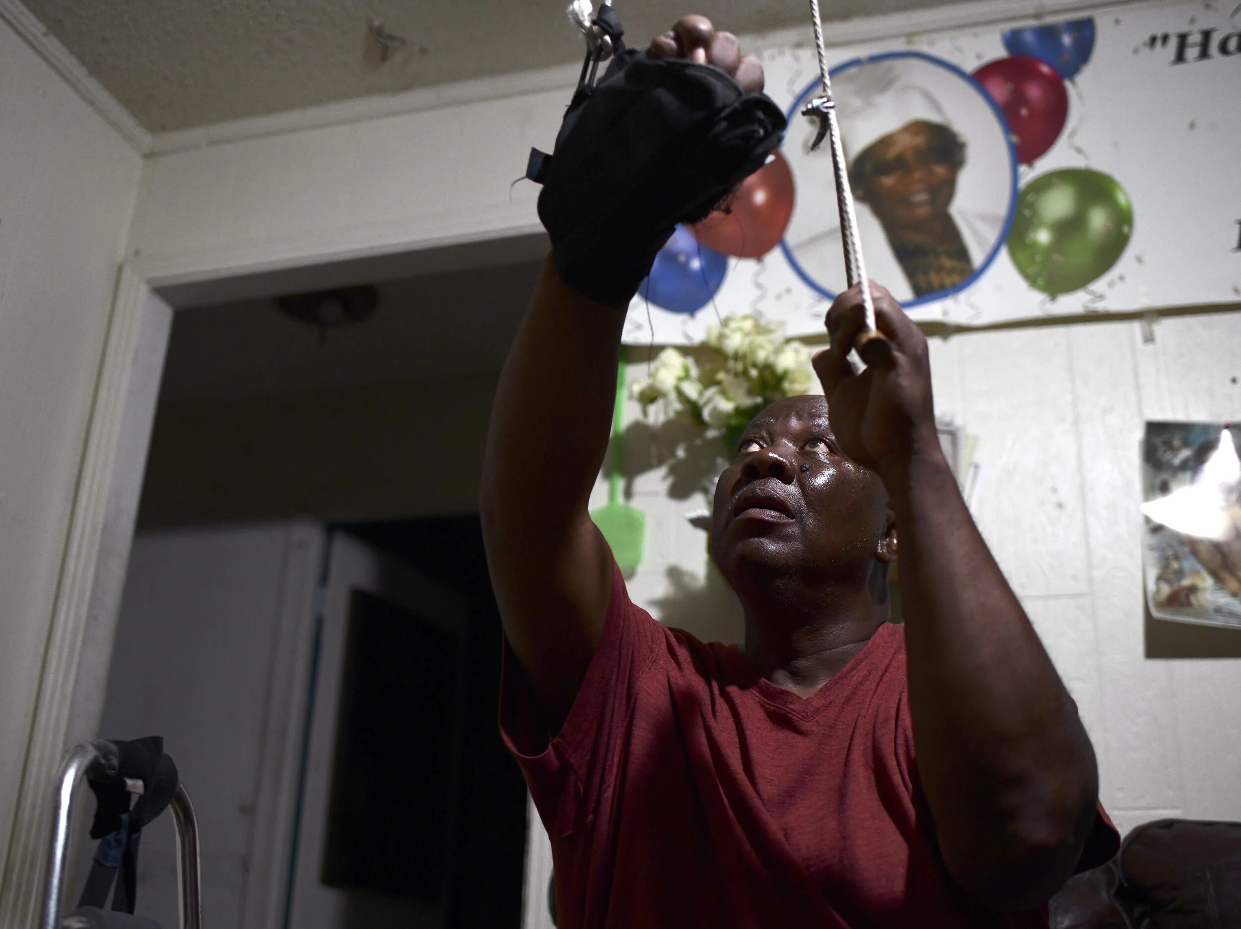 Orlando Morton exercises his right hand and arm using a pulley system his brother created by hammering nails through a leather waist belt in the ceiling at his home in Shelby, Mississippi.