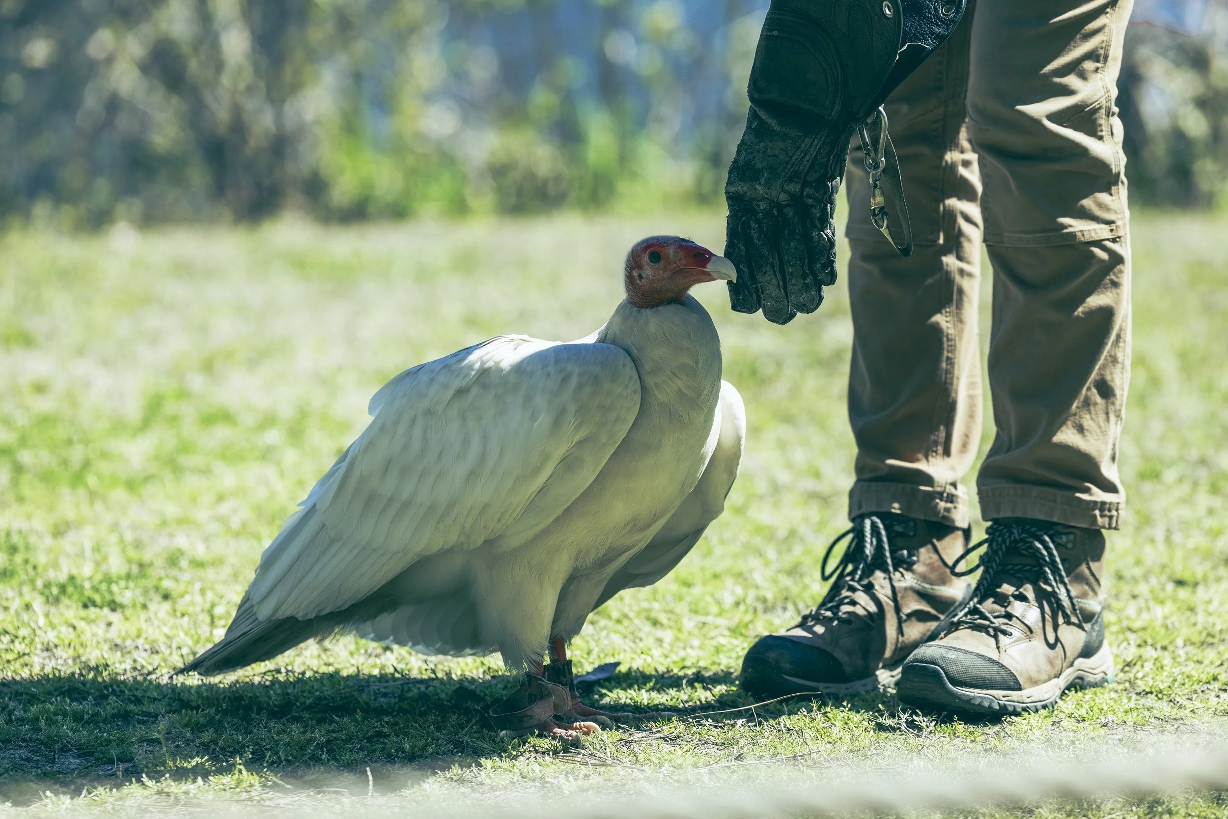 “His coloring makes his feathers fragile,” DuVall explained, her blue eyes wincing, as if it hurt to mention. Melanin in the chocolate-colored feathers of most vultures strengthens them; the lack in Wilson’s feathers leaves them brittle and more susceptible to breaking. Ragged wings can’t hold the air beneath them, and a grounded vulture must learn a different way through the world. The trainers do all they can to create a life as close to wild as possible. “He can’t fly well,” DuVall said. It sounded almost like an apology. “But he can sort of glide a short distance now.”