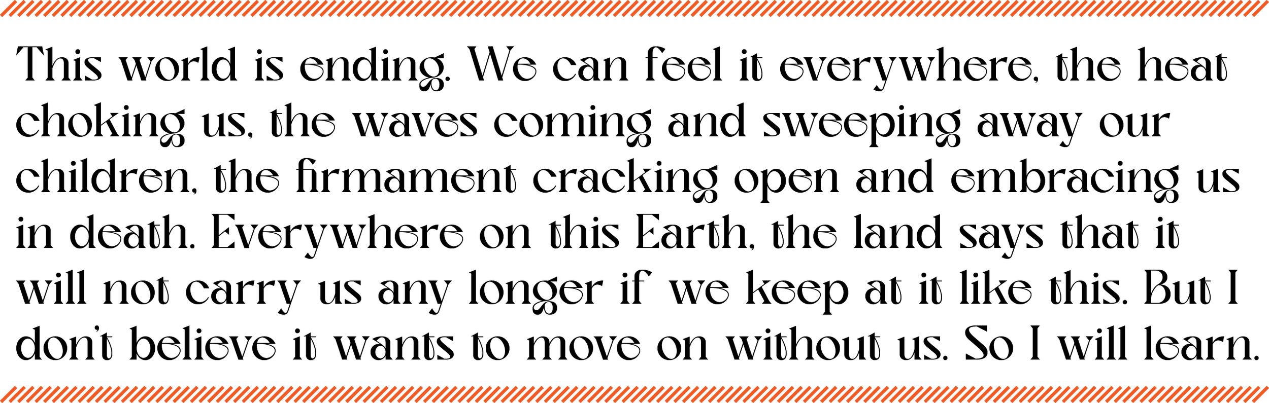 This world is ending. We can feel it everywhere, the heat choking us, the waves coming and sweeping away our children, the firmament cracking open and embracing us in death. Everywhere on this Earth, the land says that it will not carry us any longer if we keep at it like this. But I don’t believe it wants to move on without us. So I will learn. I will learn, and hopefully I can follow this Earth wherever it is going next, even if that is into the flames. I am reshaping myself into the human that I will need to be to die in this world and be reborn in the next.