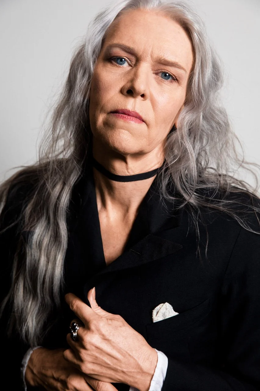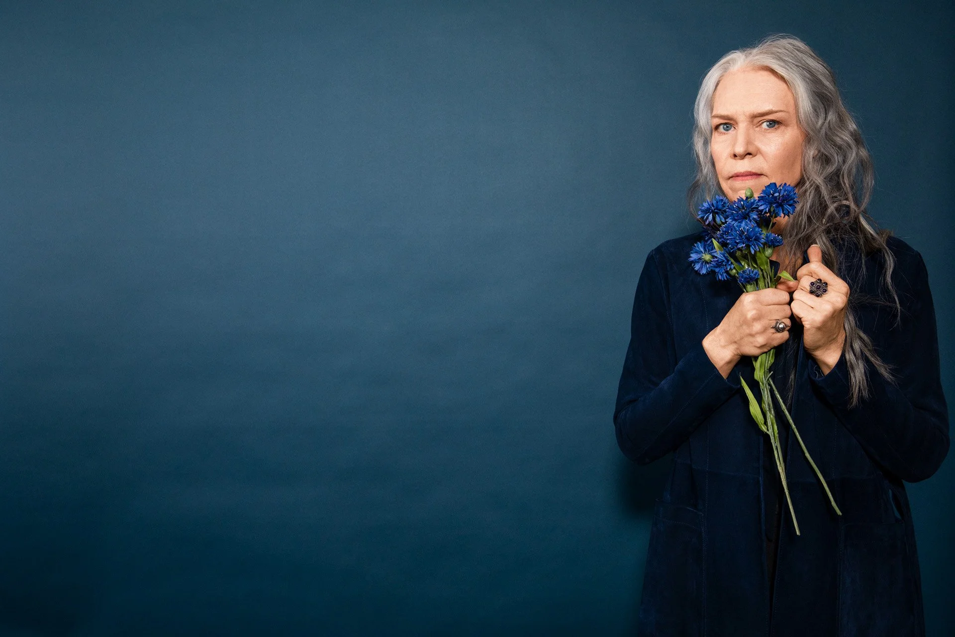 Gillian in The Shelby Italian suede duster in sapphire by Savas, available at ateliersavas.com. She wears her own rings by California street artists, c. 1980s.