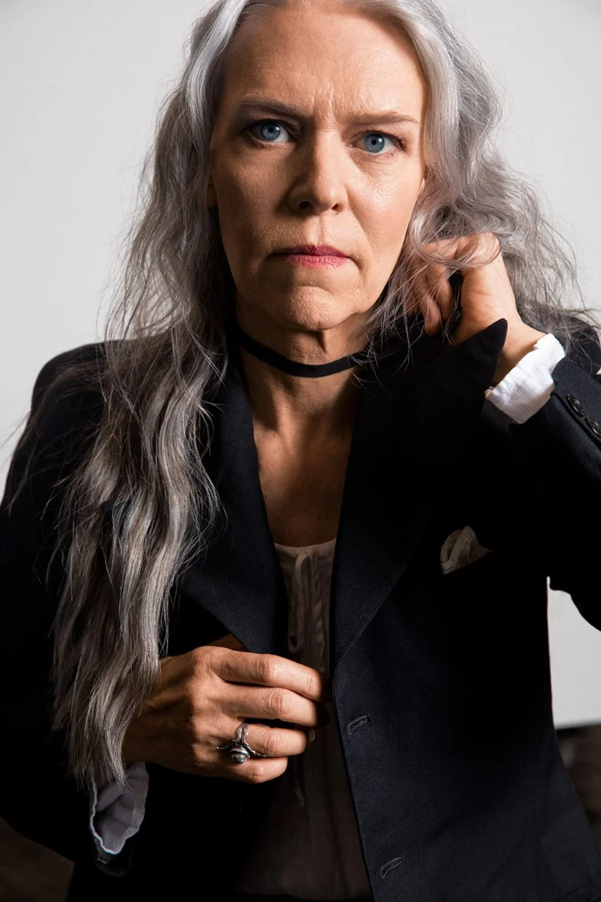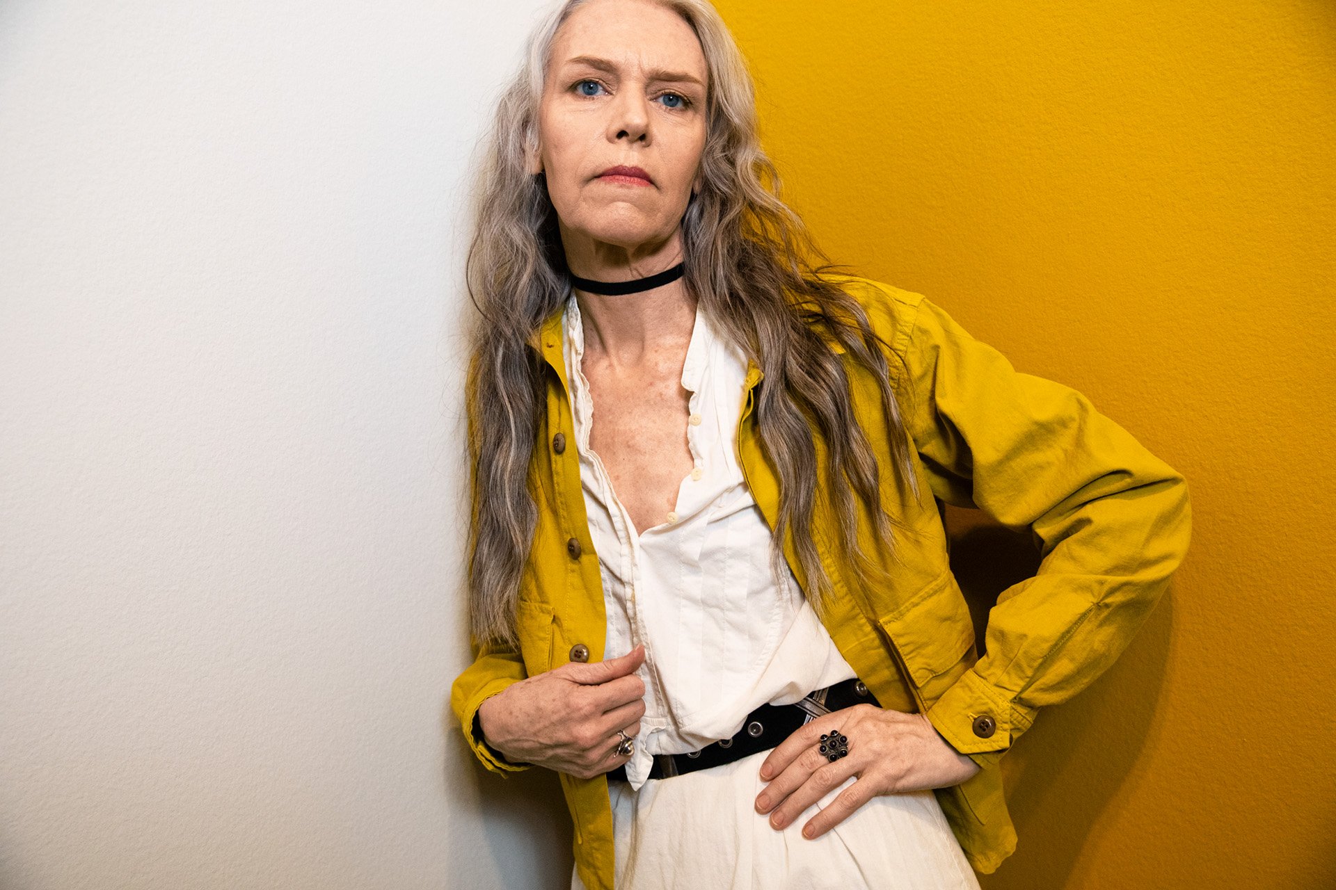 (Top Photo) Gillian Welch in The Mabel twill field jacket by imogene + willie, available at imogeneandwillie.com, with a white cotton imogene + willie shirt from Libby Callaway’s vintage collection. 1940s Taxco silver belt by Hector Aguilar and black twill ribbon choker by Gillian Welch. Photos taken at Frist Art Museum in Nashville, Tennessee.