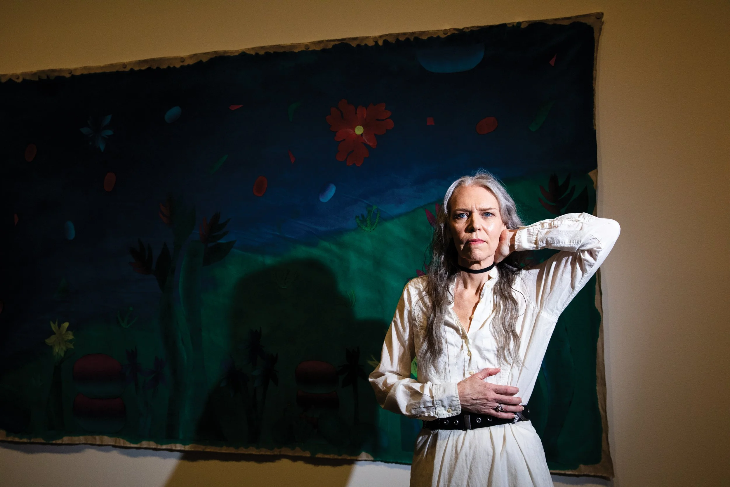 Gillian in front of “Water Meadow” by Yanira Vissepó in a white cotton shirt by imogene + willie from Callaway’s vintage collection.