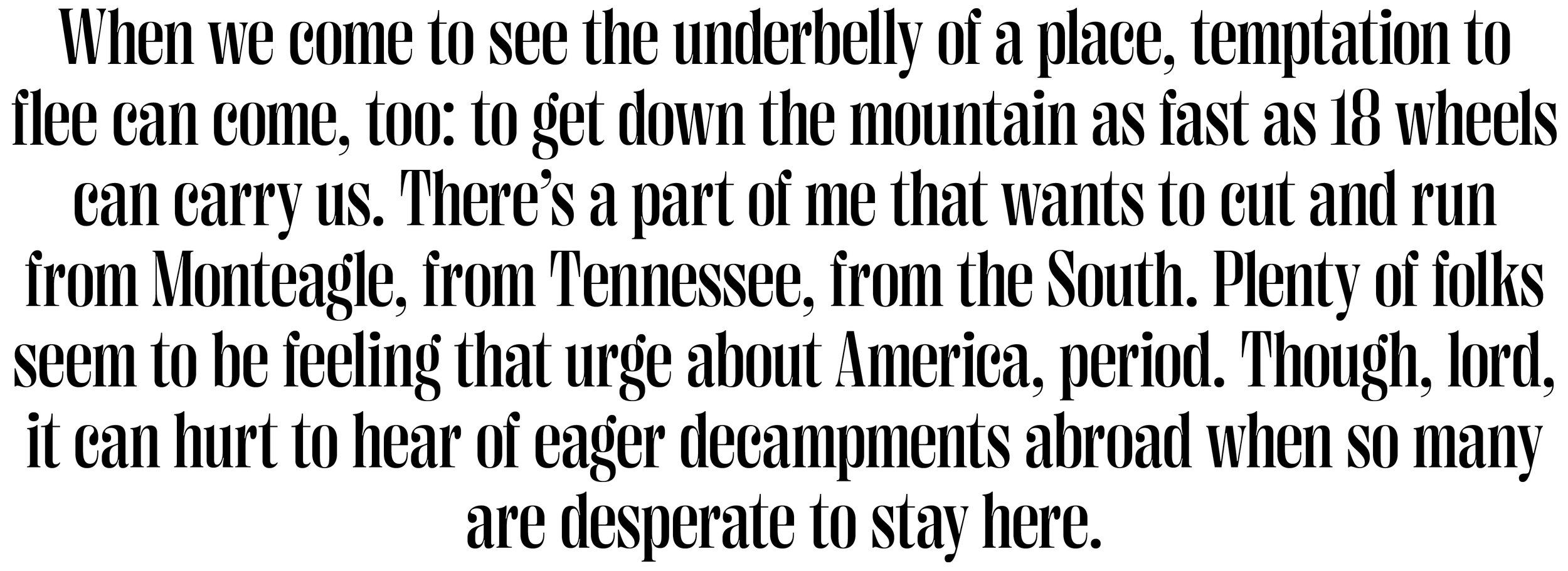 When we come to see the underbelly of a place, temptation to flee can come, too: to get down the mountain as fast as 18 wheels can carry us. There’s a part of me that wants to cut and run from Monteagle, from Tennessee, from the South. Plenty of folks seem to be feeling that urge about America, period. Though, lord, it can hurt to hear of eager decampments abroad when so many are desperate to stay here.