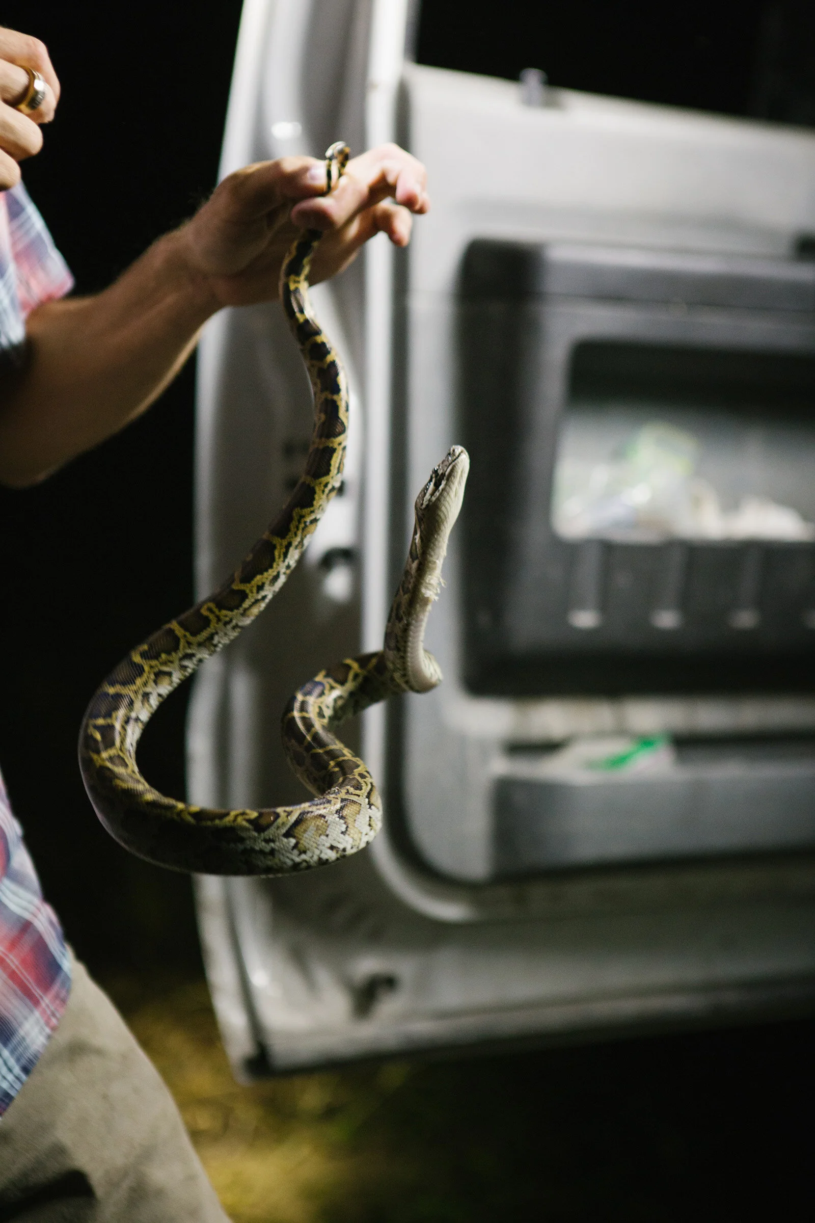 In March 2017, the South Florida Water Management District’s Governing Board piloted the Python Elimination Program. For an hourly minimum wage, plus small cash bonuses for each snake captured ($50 for the first four feet; $25 for each additional foot), local hunters would be tasked with wrangling a python population estimated in the tens of thousands, one snake at a time. From 1,000 applications, the governing board selected just 25 experienced hunters, including Mike Kimmel. Kimmel had never hunted a python before, and he doubted the problem was anything more than a few well-publicized incidents of escaped pets.