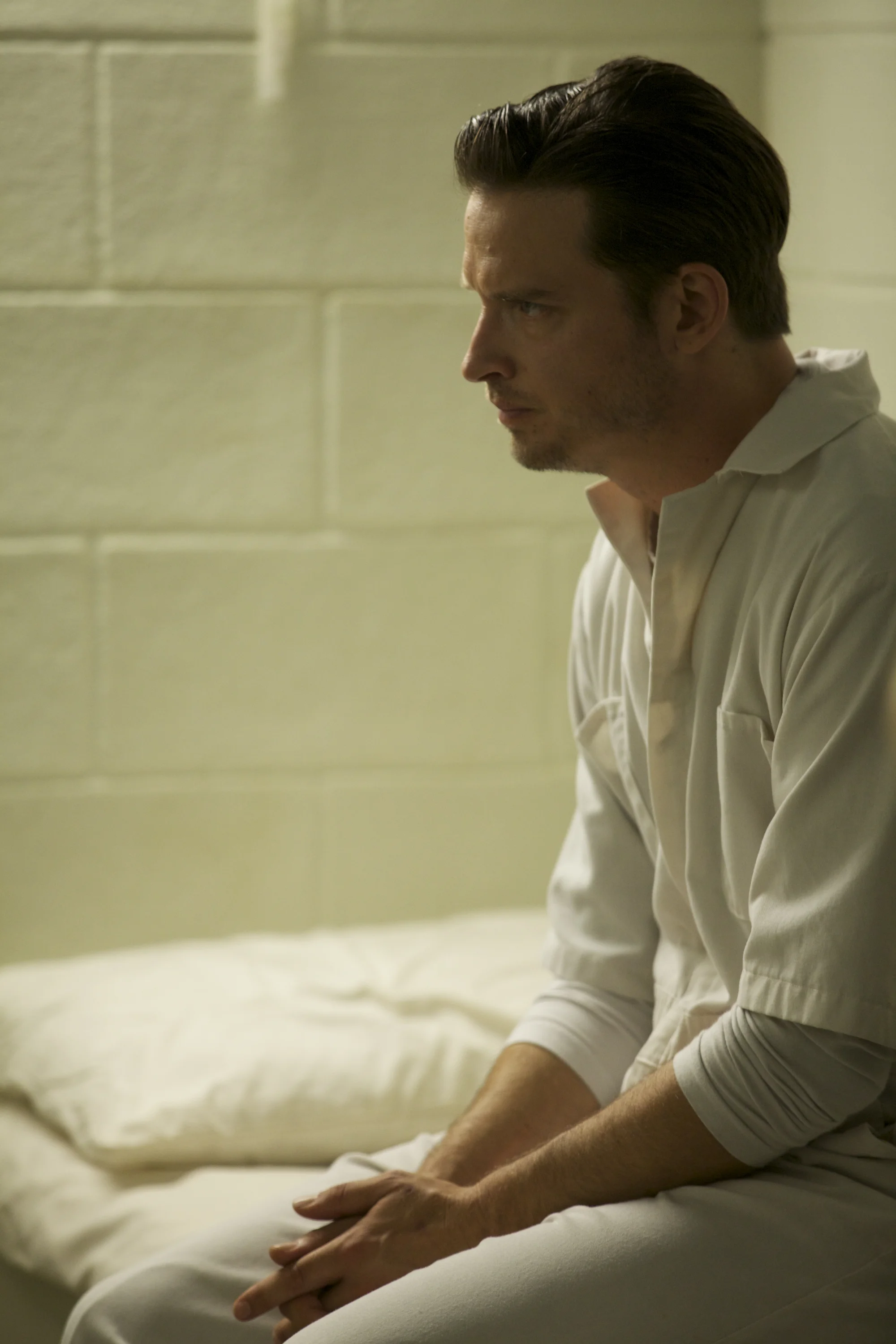 Where the actors have their greatest effect on the show is in their interpretations of the action lines the writers give them between sections of dialogue. Consider this one from McKinnon’s pilot script, which comes just after a young prison guard hands Daniel a suit, shirt and tie and says, “I’m supposed to take your prison clothes”: