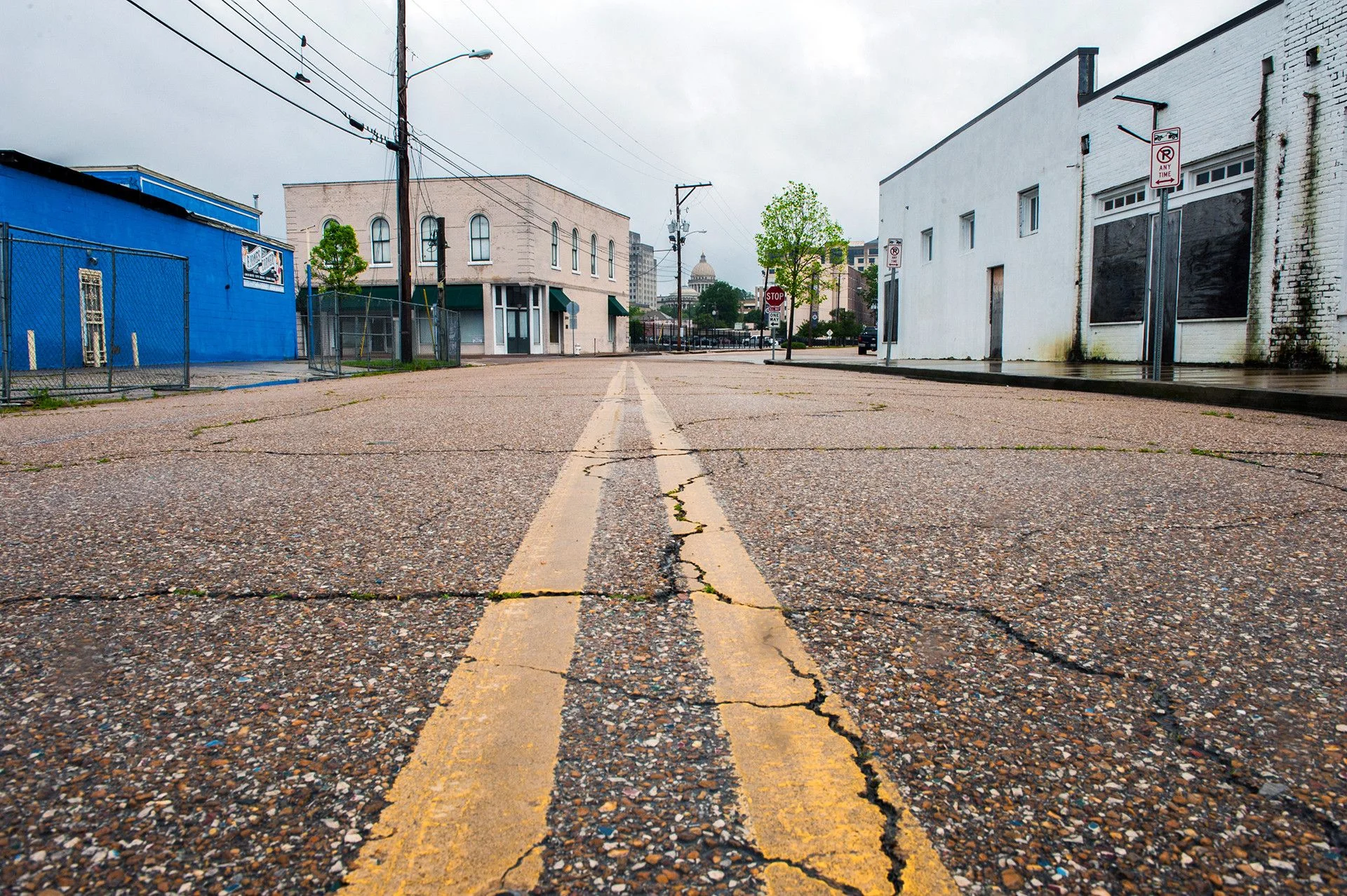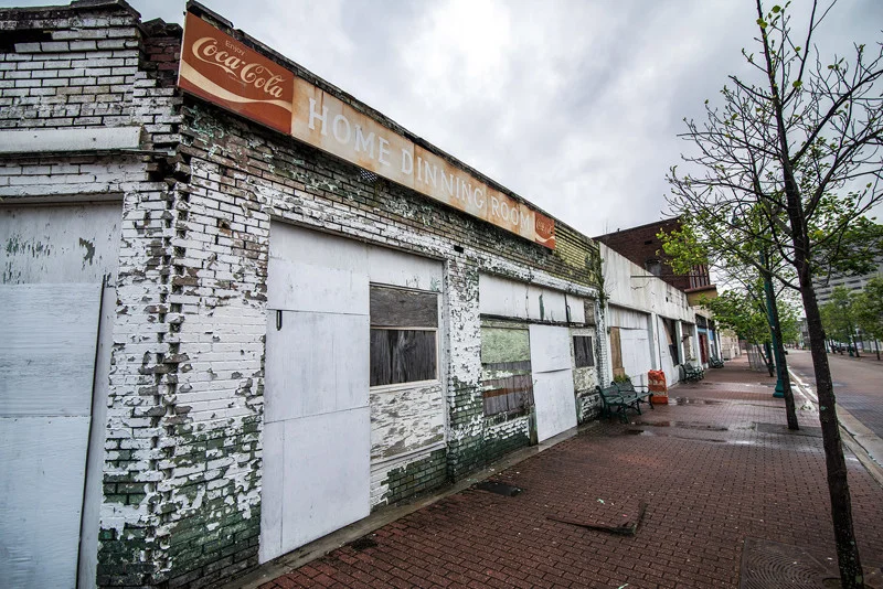 At the southern foot of the historic district on Farish Street, every storefront is empty. Of some, only walls remain, framing overgrown lots of grass. Yet, oddly, the sidewalk bricks are neatly laid and swept.