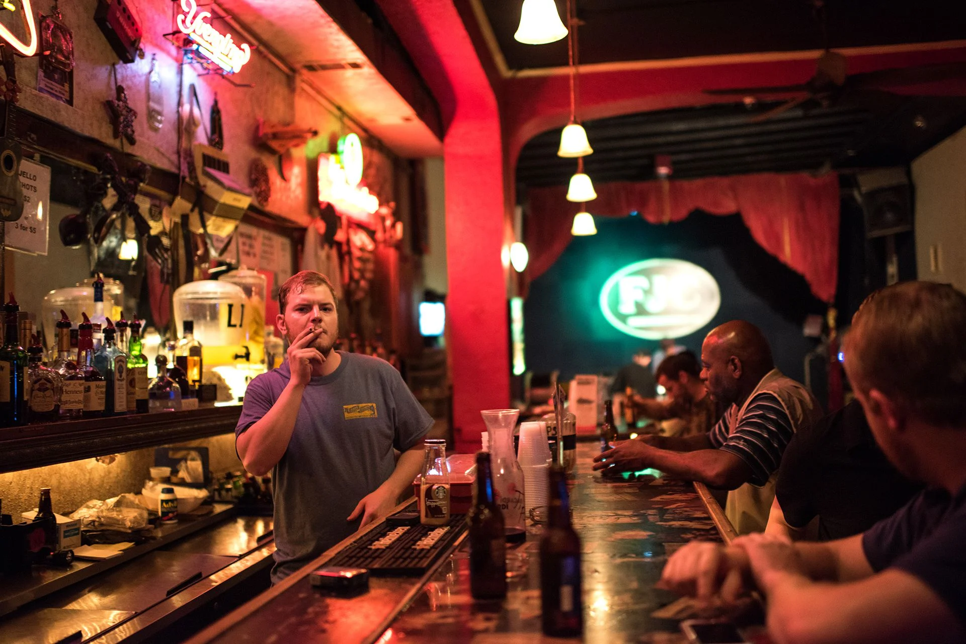 And there, further down the bar, is the middle-aged black man who refuses to give his name. He just says that he’s been to 48 states, speaks four languages, and there’s no place he’d rather be than this bar.